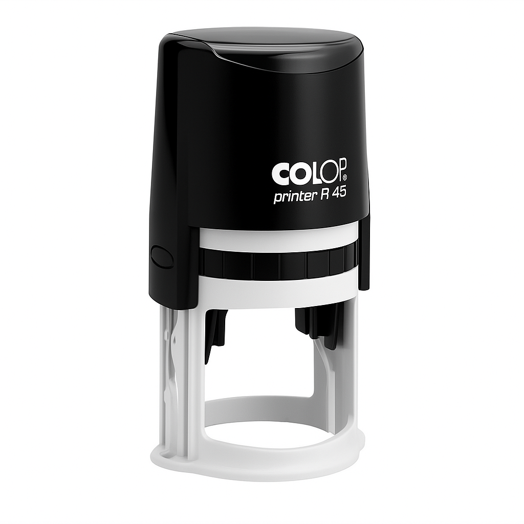 Ավտոմատ սարքավորում կլոր տպագրության համար Colop Printer R45, 45 մմ սև ծածկով, պլաստիկ ամուր պատյան՝ տեքստի ավտոմատ գունավորմամբ, ներքևի ծածկը թույլ է տալիս արգելափակել մարմինը ծալված կոմպակտ ձևով։